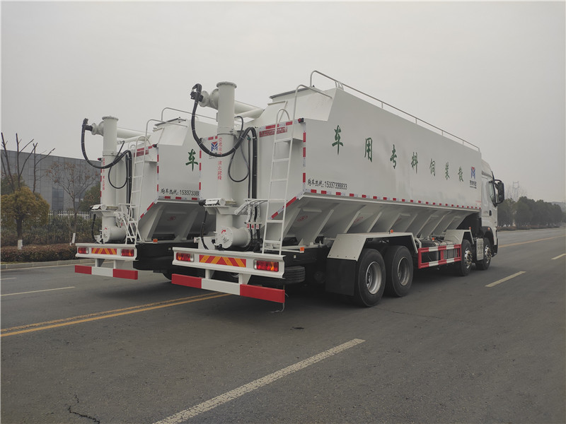 散裝飼料車,又名散裝飼料運(yùn)輸車,飼料運(yùn)輸車。結(jié)構(gòu)簡單、性能可靠、輸送量大、操控方便、機(jī)動(dòng)性強(qiáng)、對物料無污染等特點(diǎn),廣泛應(yīng)用于各大中小型養(yǎng)殖企業(yè)的飼料的運(yùn)輸。散裝飼料車的飼料罐架設(shè)在卡車的底盤上,罐頂開有進(jìn)料口.頂部的一根螺旋輸送卸料管(俗稱卸料絞龍)則可自由回轉(zhuǎn)和抬升,抬升的仰角可達(dá)60度。運(yùn)輸時(shí),頂部的螺旋管平臥在罐頂;卸料時(shí)則抬起,使管端的出料口與畜禽飼養(yǎng)場貯料罐頂部的進(jìn)料門相接,駕駛室內(nèi)裝有操縱裝置(操縱裝置也可裝置在罐體尾部),卸料時(shí)通過車底的動(dòng)力輸出軸和減速器來驅(qū)動(dòng)螺旋,以完成卸料。