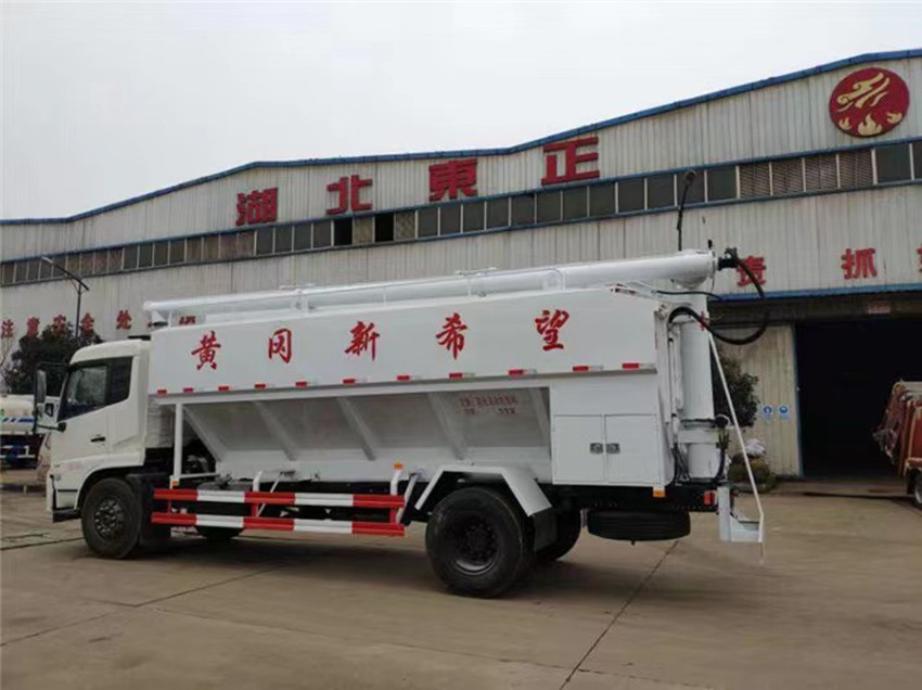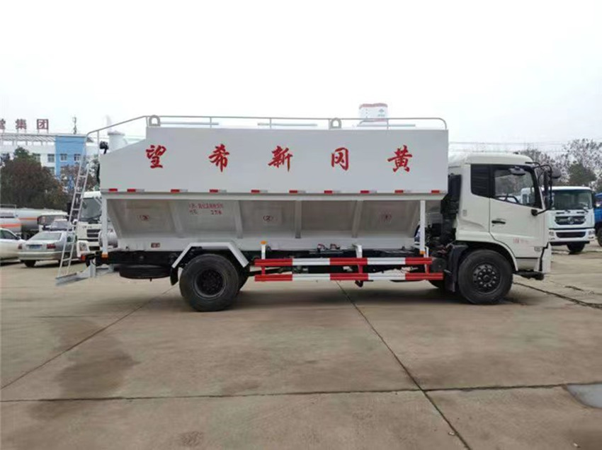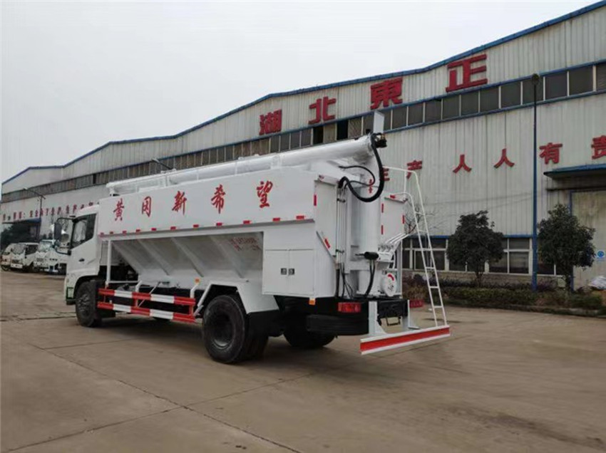 散裝飼料運(yùn)輸車(chē),散裝飼料車(chē)的飼料罐架設(shè)在卡車(chē)的底盤(pán)上,罐頂開(kāi)有進(jìn)料口.頂部的一根螺旋輸送卸料管(俗稱(chēng)卸料絞龍)則可自由回轉(zhuǎn)和抬升,抬升的仰角可達(dá)60度。運(yùn)輸時(shí),頂部的螺旋管平臥在罐頂;卸料時(shí)則抬起,使管端的出料口與畜禽飼養(yǎng)場(chǎng)貯料罐頂部的進(jìn)料門(mén)相接,駕駛室內(nèi)裝有操縱裝置(操縱裝置也可裝置在罐體尾部),卸料時(shí)通過(guò)車(chē)底的動(dòng)力輸出軸和減速器來(lái)驅(qū)動(dòng)螺旋,以完成卸料。