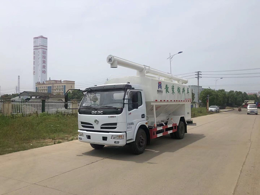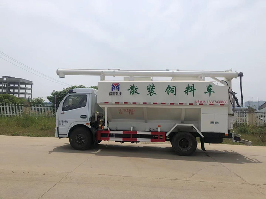 散裝飼料運(yùn)輸車,散裝飼料車的飼料罐架設(shè)在卡車的底盤上,罐頂開有進(jìn)料口.頂部的一根螺旋輸送卸料管(俗稱卸料絞龍)則可自由回轉(zhuǎn)和抬升,抬升的仰角可達(dá)60度。運(yùn)輸時(shí),頂部的螺旋管平臥在罐頂;卸料時(shí)則抬起,使管端的出料口與畜禽飼養(yǎng)場(chǎng)貯料罐頂部的進(jìn)料門相接,駕駛室內(nèi)裝有操縱裝置(操縱裝置也可裝置在罐體尾部),卸料時(shí)通過(guò)車底的動(dòng)力輸出軸和減速器來(lái)驅(qū)動(dòng)螺旋,以完成卸料。